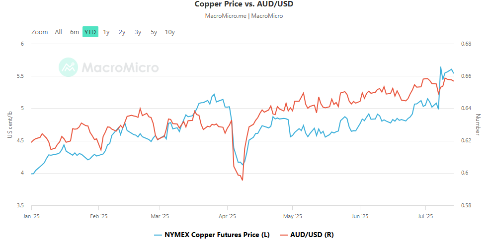 تُعد أستراليا مصدرًا رئيسيًا لخام الحديد والفحم والنحاس وغيرها من الموارد، ولذلك يرتبط الدولار الأسترالي عادةً بأسعار هذه السلع. وبعد أن أعلن الرئيس الأمريكي ترامب عن فرض رسوم على واردات النحاس، ارتفعت الأسعار وزاد الطلب على الصادرات الأسترالية، مما دعم العملة.