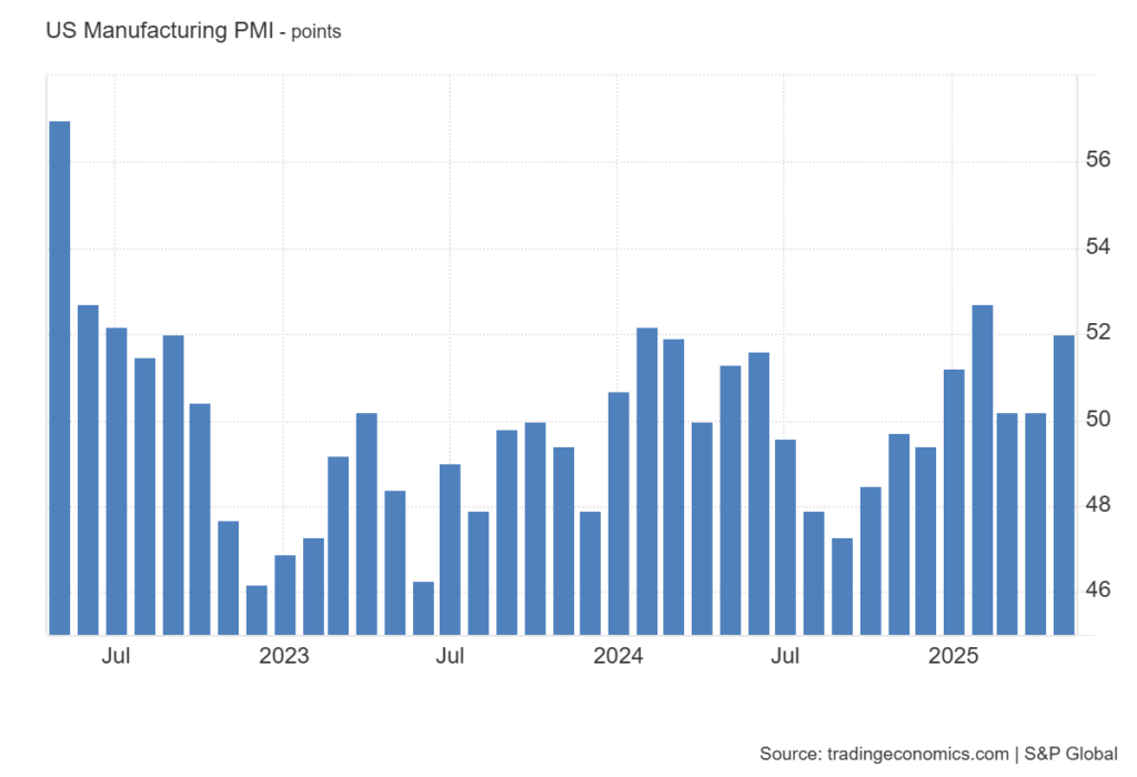 UK PMI showed mixed results, with the composite index reaching 53, the strongest in a year, with services continuing to show promising results. However, manufacturing continues to contract, showing a figure of 47.3 as factories are struggling with weak demand and export challenges due to US tariffs. Services came in at 53.6, continuing its strong momentum. ⁽⁵⁾