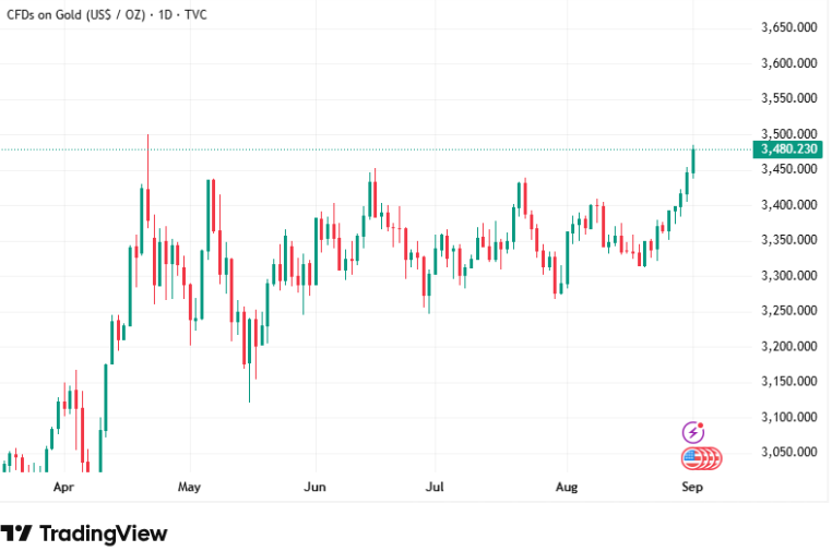 Gold extended its rally for a fourth straight session, pushing toward multi-month highs near $3,480. The surge comes as traders raise bets on a potential Fed rate cut in September, following softer US inflation data measured by the PCE index. Safe-haven demand has also been buoyed by rising geopolitical tensions and renewed concerns over the Fed’s independence.